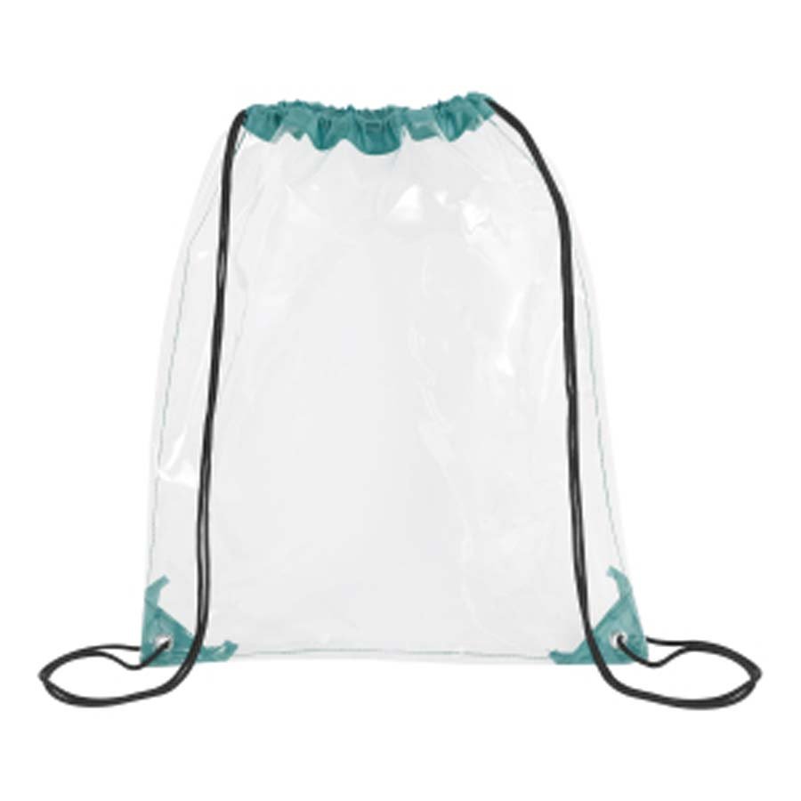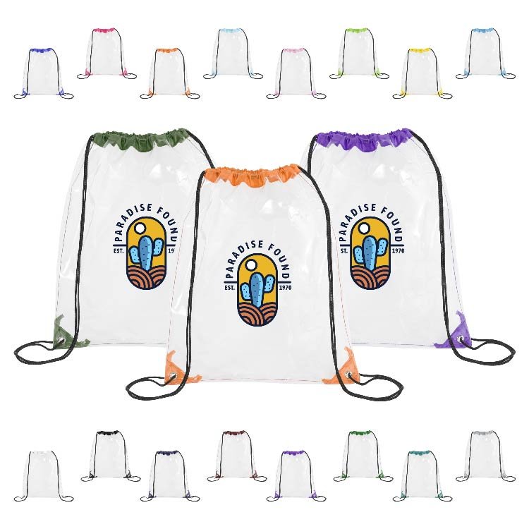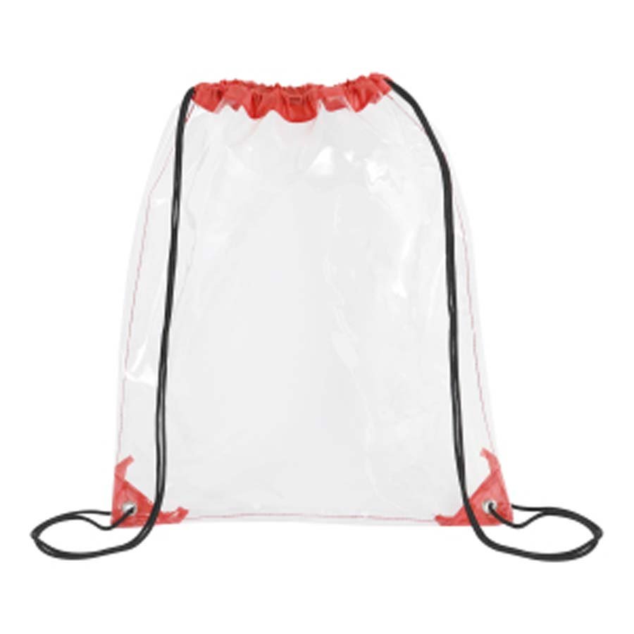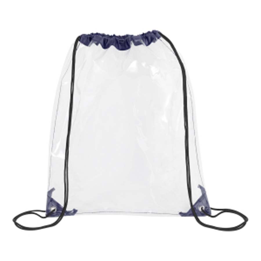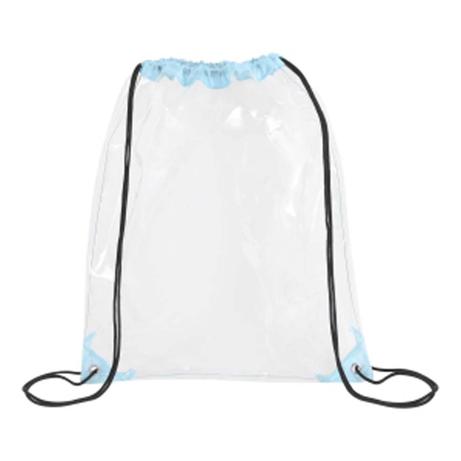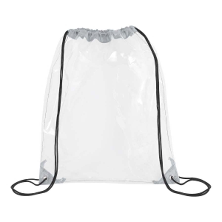 This stadium approved clear drawstring backpack is crafted from 0.2 mm PVC that meets CPSIA and Prop 65 safety standards. Measuring 14 x 17 inches, it features reinforced corners, metal grommets, braided drawstring straps for cinch-over-shoulder carry, and two reflective strips to enhance visibility. Ideal for concerts, sports events, festivals, schools, or workplace security, it also offers a large imprint area for impactful branding.