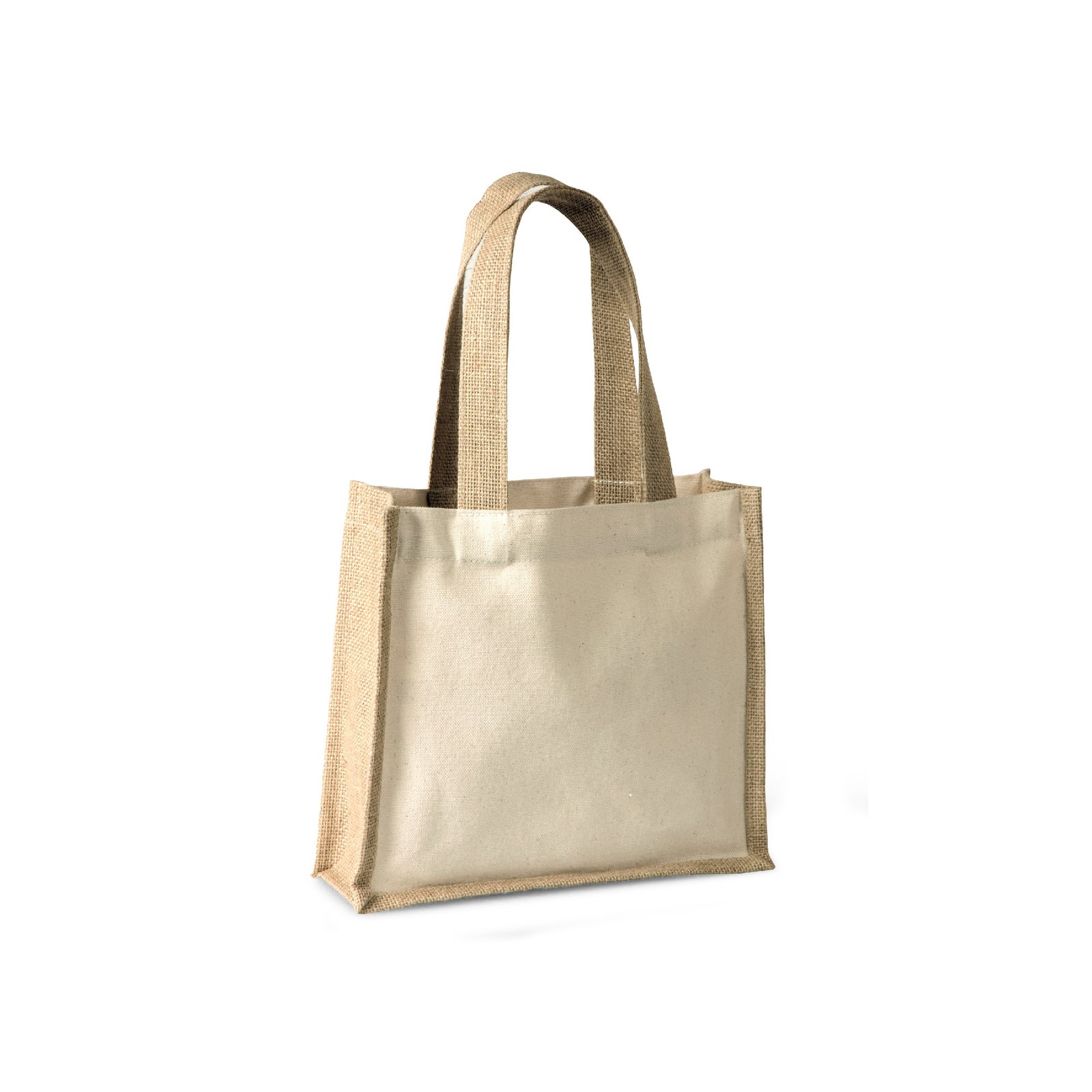 This cotton gift bag with jute accents and self-handle is perfect for small items like soaps, herbs, gifts, or a childâs lunch. Its compact size makes it ideal as a party favor bag, gift bag, or a charming mini handbag. Dimensions: 10″W x 9″H x 3″DGusset.