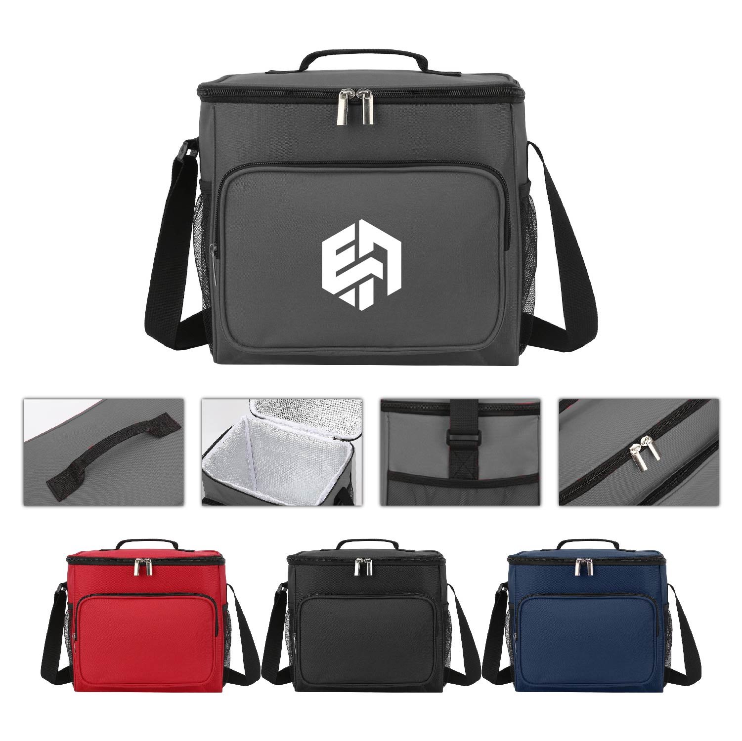 Take meals on the go with ease using the Cubic Insulated Cooler Tote. Designed with thermal foil lining and tough 300D polyester, it helps maintain optimal food and beverage temperatures. The product size of 10.2” x 6.7” x 9.4” makes it compact yet spacious for everyday use. An adjustable shoulder strap provides comfort, while the front zippered pocket and two side mesh pockets add smart storage. Thanks to its collapsible structure, this tote is also easy to store. Add your logo to the front and make a lasting impression at giveaways or promotional events.