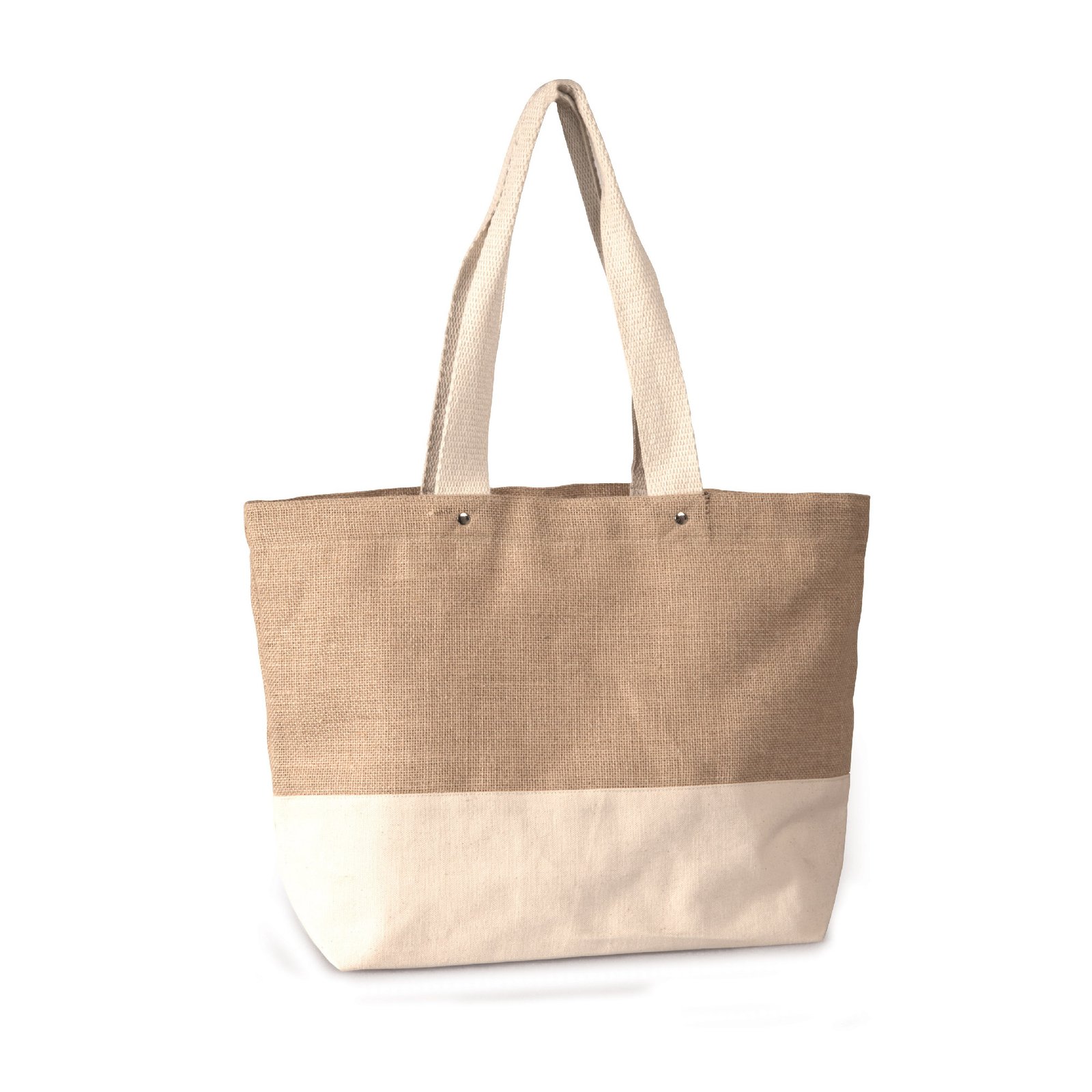 This stylish jute and cotton shopping bag features durable rivets and sturdy cotton webbed handles for added strength and comfort. Made from eco-friendly materials, itâs a sustainable choice for daily errands, shopping, or casual outings. Dimensions: 18.5″W x 13″H x 5″Gusset.