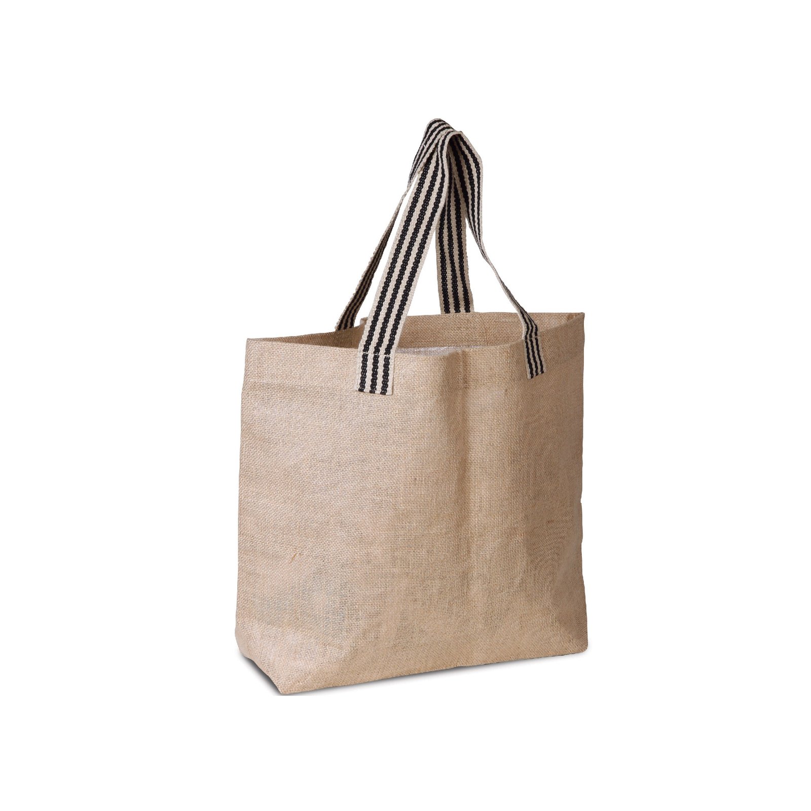 This laminated jute/burlap beach bag features decorated cotton webbed handles for a stylish touch and added comfort. Durable, sturdy, and fashion-forward, itâs perfect for the beach or everyday use. Crafted from eco-friendly materials, this bag offers both sustainability and quality you can rely on. Dimensions: 20″W x 15″H x 5″D gusset.