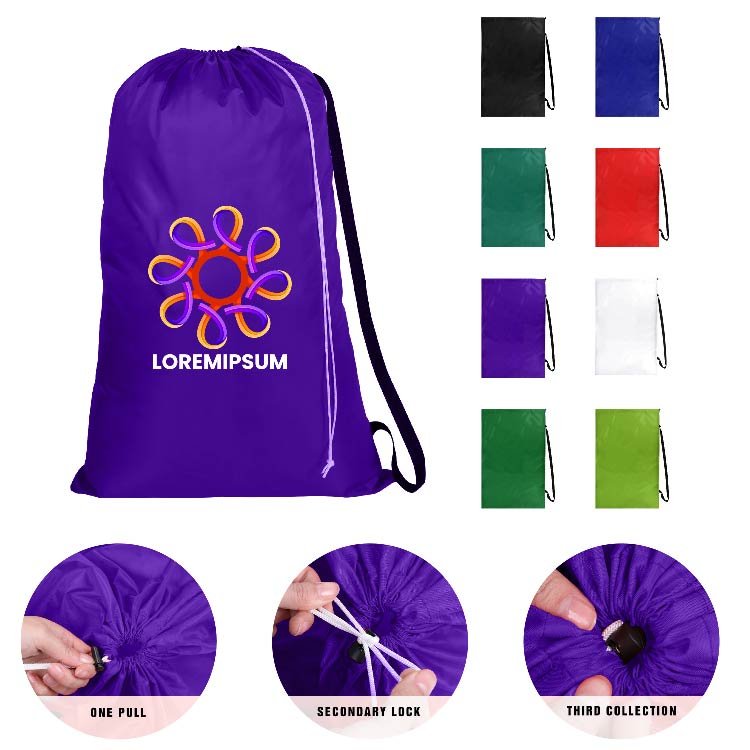 This school and gym drawstring laundry bag is built to last with durable 210D polyester and reinforced double stitching. At a generous 23 x 35.5 inch size, it easily fits laundry baskets or daily gym clothes. The convenient drawstring with spring lock secures contents, while the adjustable nylon shoulder strap allows hands-free carrying-a practical choice for dorms, resorts, gyms, or school stores.