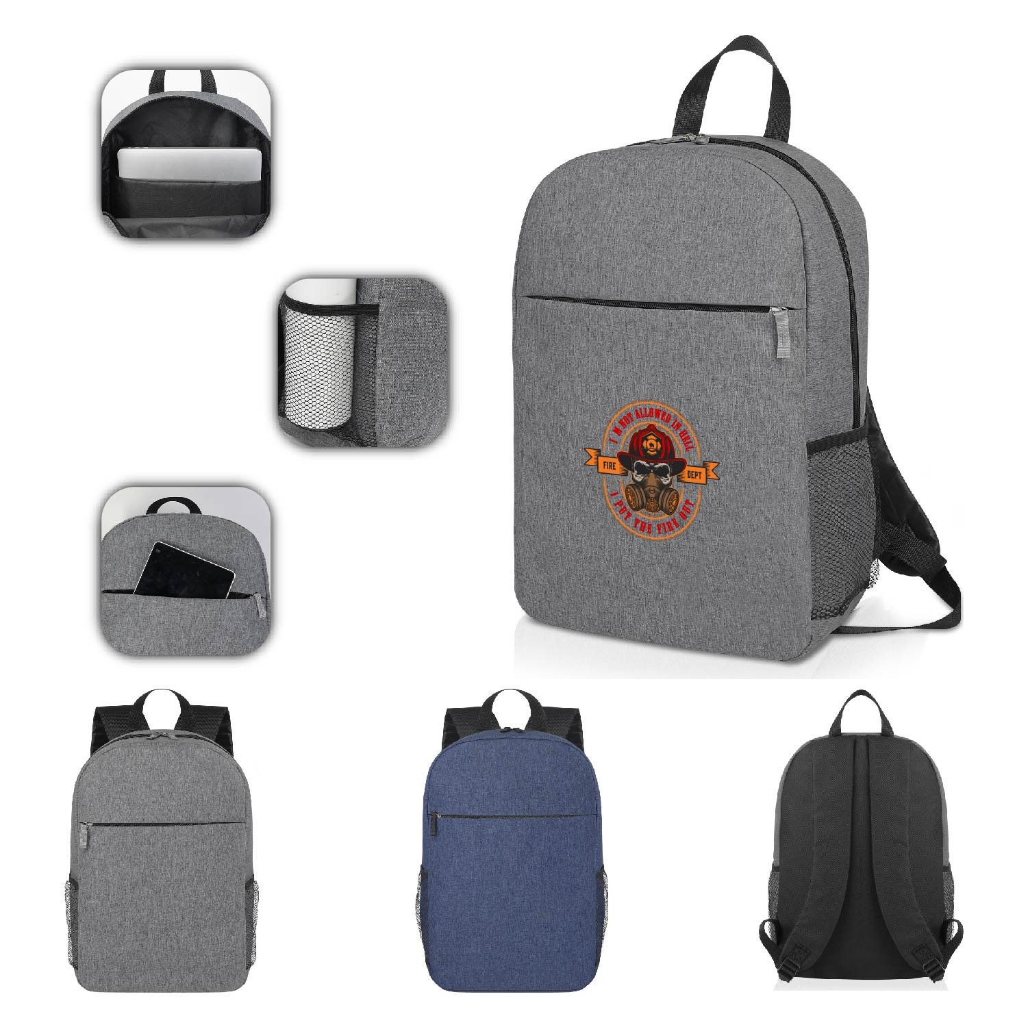 The Office Laptop backpack is designed to fit laptops up to 15 inches with a padded sleeve for protection. It offers a large main compartment to hold clothes, snacks, or books, plus a front zippered pocket for small items. Two side mesh pockets can carry drinks or an umbrella, while padded back and adjustable shoulder straps add comfort for daily use. The backpack measures 12 by 5.5 by 17.3 inches and has a 6 by 6-inch front imprint area, ideal for adding your logo.
